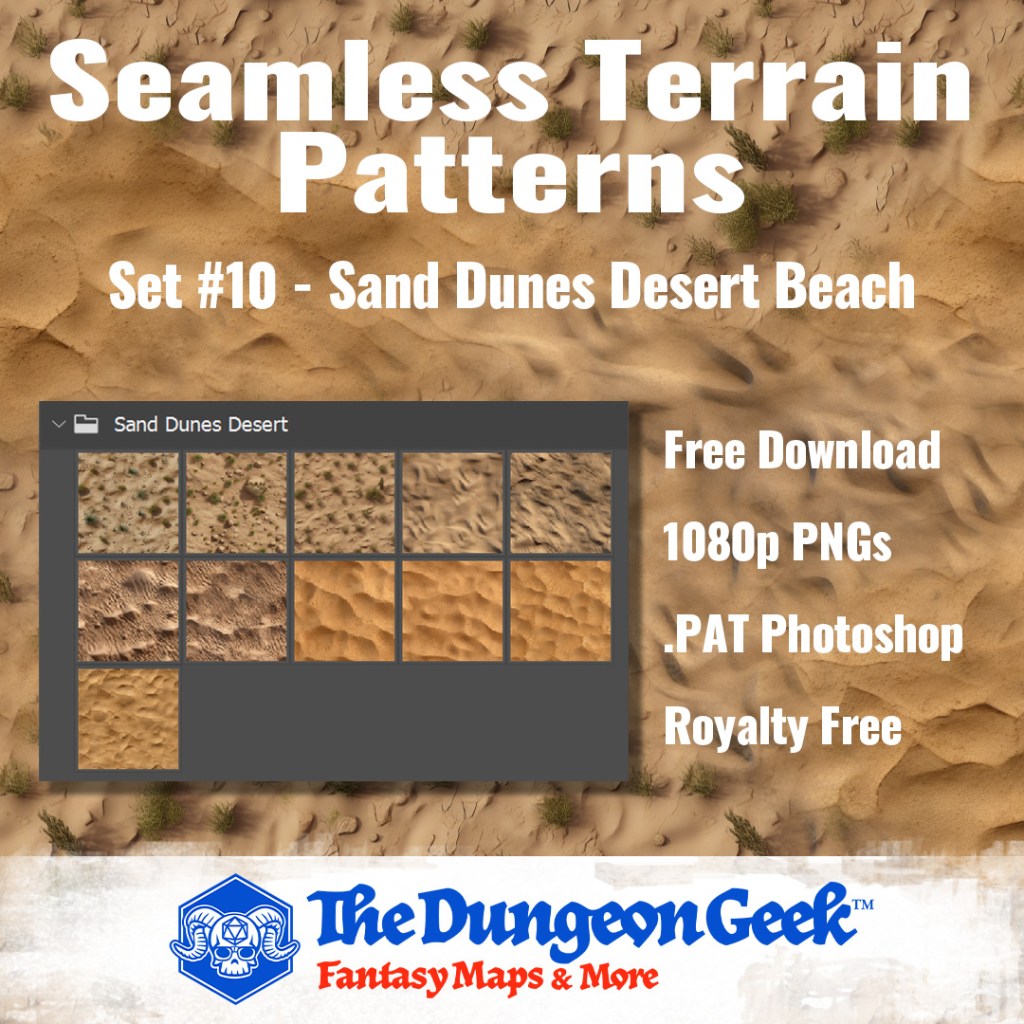 Embark on a journey to the arid landscapes with our latest texture pack: Desert & Beach Sand. This captivating collection features eleven meticulously crafted sand textures that will transport your TTRPG maps to the vast deserts and stunning beaches. Whether you’re creating encounters in a scorching desert wasteland or designing a tropical paradise, these textures will infuse your maps with the essence of sand and sun.